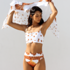 La tela es una licra reciclada (82% Poliéster Reciclado Repreve/ 18% Spandex) certificada por Global Recycled Standard. Liga de látex/caucho, hilo de poliéster y avios de metal.