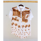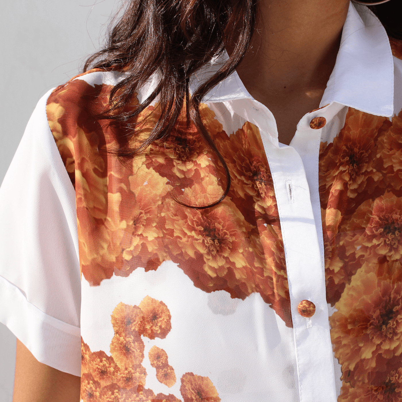 La tela es un chifón recuperado (100% poliéster) obtenido de una empresa dedicada a rescatar excedentes textiles. La base de los botones es de metal. El hilo con el que se cose es 100% poliéster.