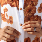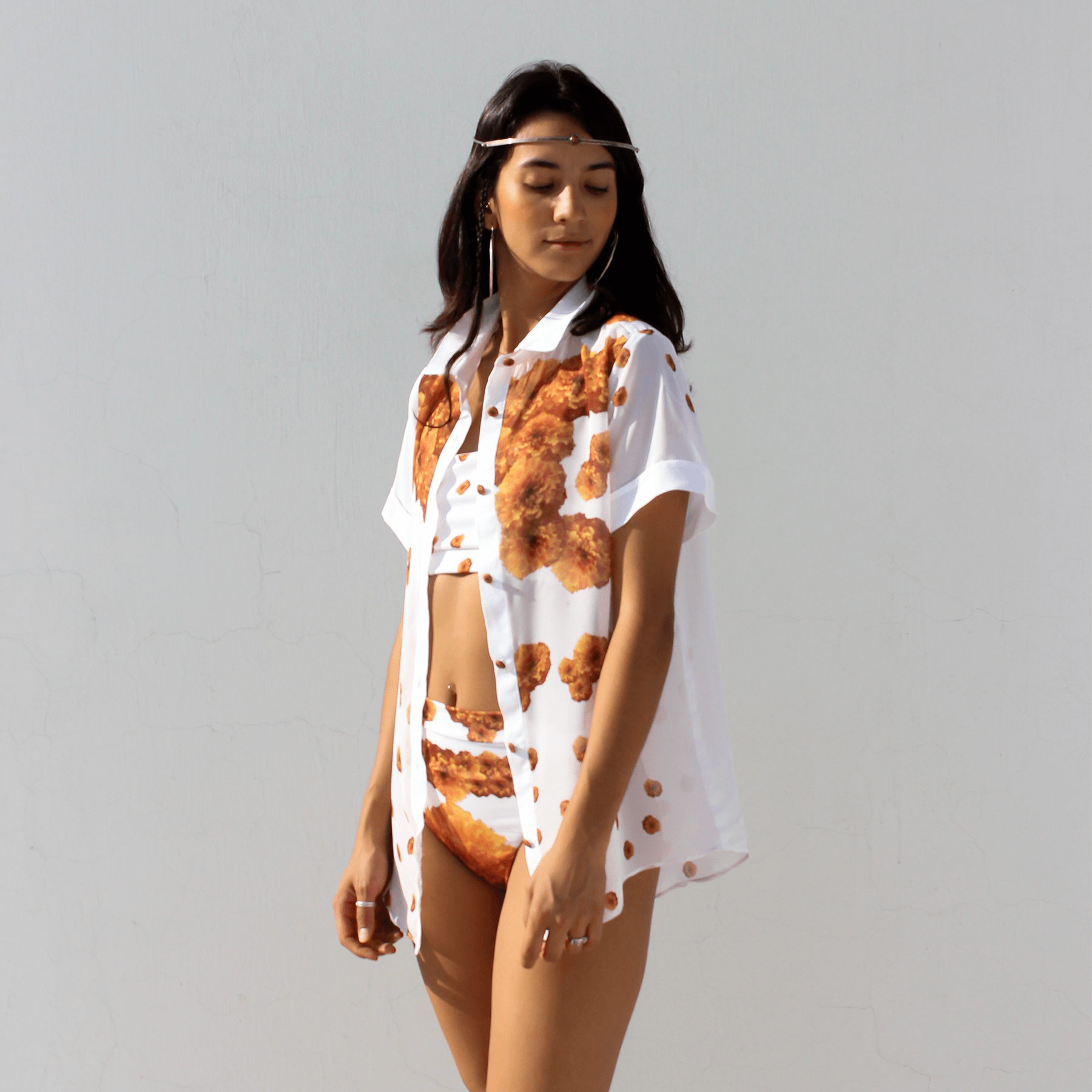 La empresa dedicada a la recuperación de textiles es Trendingtopic. El diseño para la sublimación es de la autora de la colección. La prenda es confeccionada por la costurera Leticia de Sahuayo, Mich.